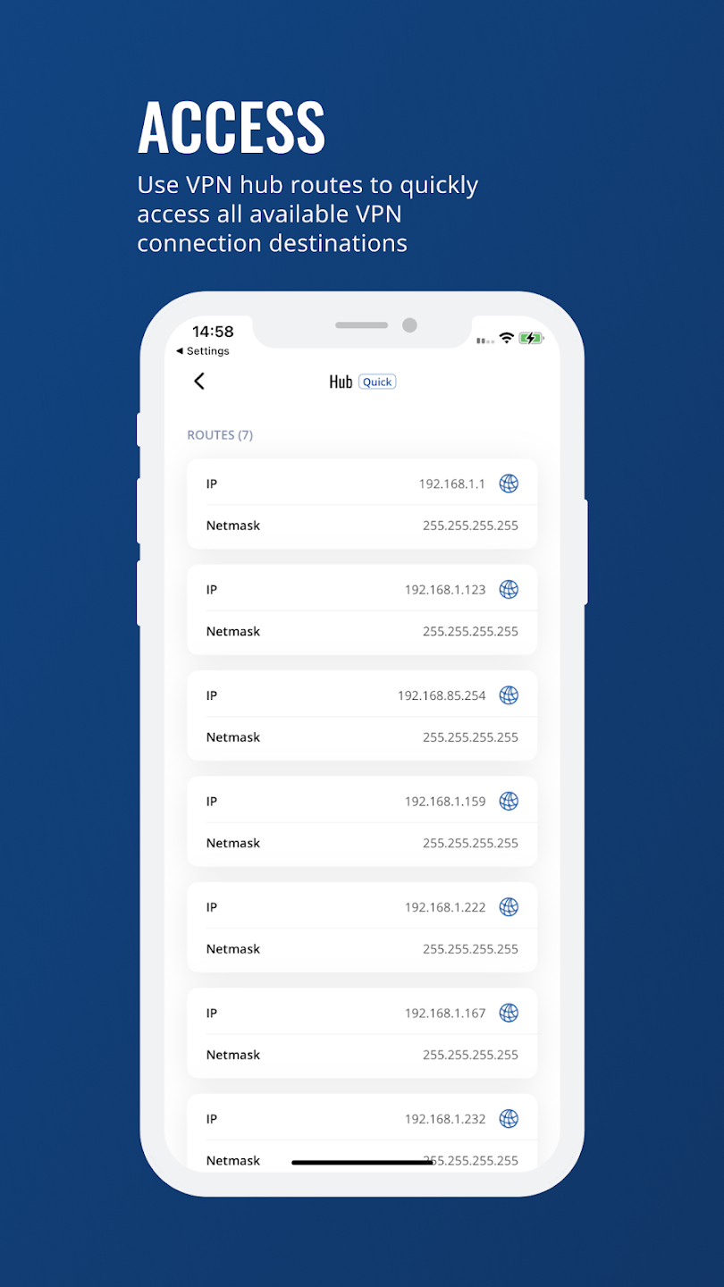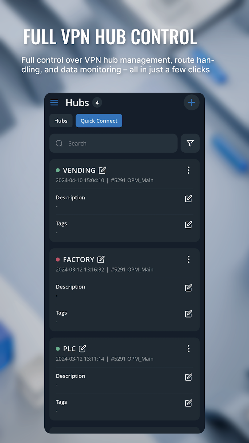 Tanto si trabaja desde un dispositivo Android como iOS , esta aplicación de Teltonika le permite ver el estado de la conexión, los detalles de enrutamiento, las rutas de tráfico reenviadas y la información del servidor. Esta información le proporciona una visibilidad operativa clara y le ayuda a mantener una experiencia fluida y controlada mientras trabaja en redes remotas. Quick Connect crea acceso temporal al producto, mientras que la VPN puede utilizarse en todo momento.
