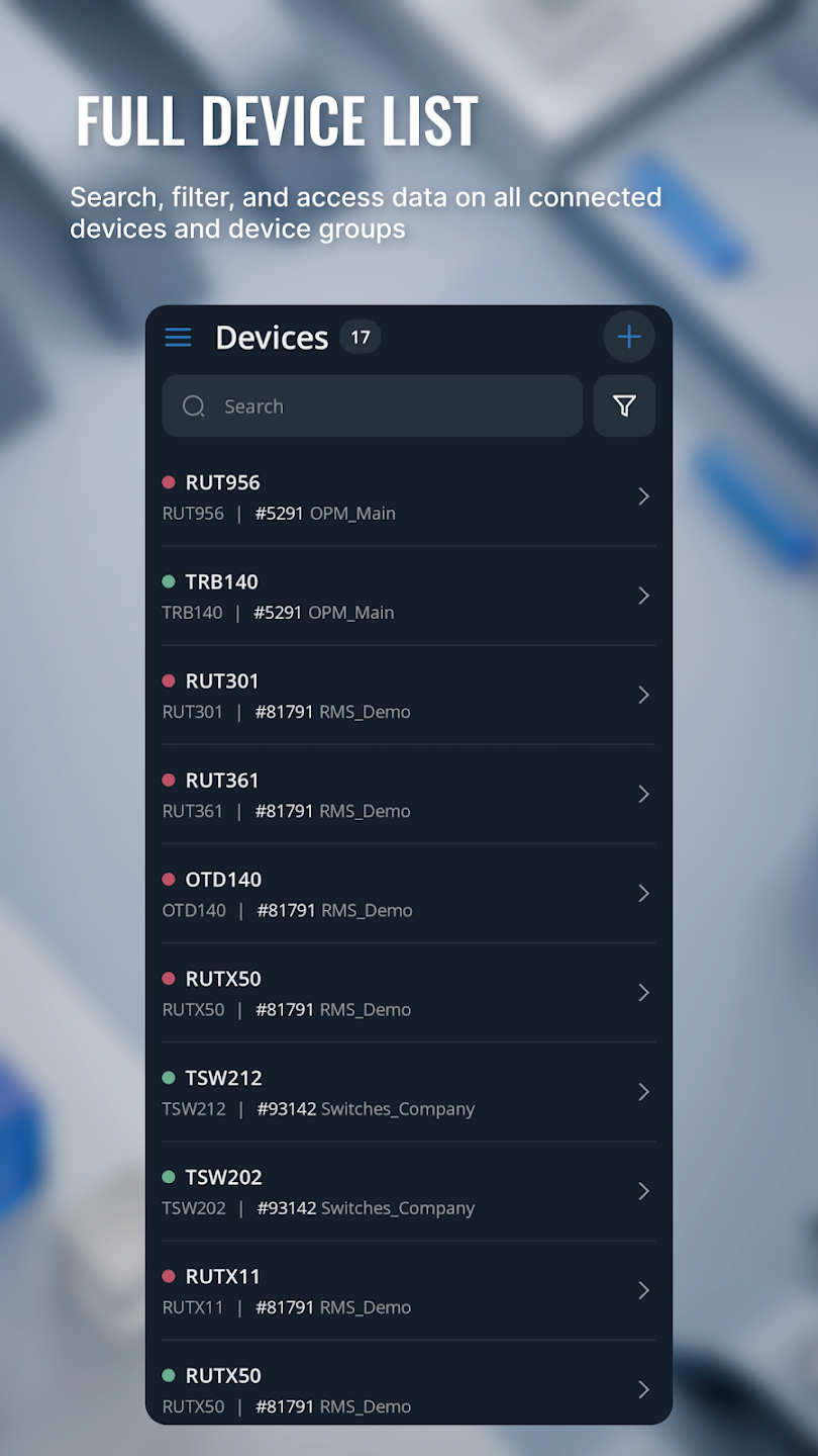 La aplicación Teltonika RMS ofrece todas las funciones del sistema de gestión remota directamente en su dispositivo móvil. Disponible para iOS y Android , proporciona acceso inmediato y en cualquier lugar a los equipos Teltonika y a dispositivos de terceros compatibles.