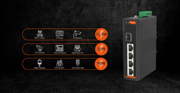 La incorporación de este nuevo estándar permite a los switches Fiberroad satisfacer cualquier necesidad para la alimentación de dispositivos externos para aplicaciones como IoT. En la siguiente figura vemos un ejemplo de un switch colocado en un poste en cualquier ciudad alimentando un AP WiFI (15W), unas cámaras de video (30W), unos dispositivos de iluminación (60W) y hasta un display (90W) además de poderle conectar a sus entradas digitales sensores de presencia/antivandalismo o incluso de CO2 para el envío de alarmas mediante traps SNMP.