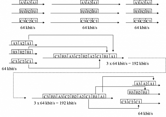 En la figura siguiente vemos un ejemplo donde multiplexamos 3 flujos de 64Kbit/s de velocidad cada uno resultando en un flujo combinado teórico de 3 x 64 = 192 Kbit/s