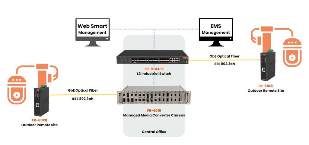 El FR-6103I soporta gestión remota a través de interfaz web y SNMP y protocolo 803.ah OAM para gestión remota a través de la fibra incluyendo ‘dying gasp’ para la notificación de caída de alimentación. También soporta jumbo frames, propagación de fallos entre las interfaces óptica y eléctrica y ALS (Automatic Laser Shutdown) así como el control del caudal en ambos interfaces. Admite configuración ‘standalone’ o ‘remote’ como conversor remoto gestionado a través del conversor central.