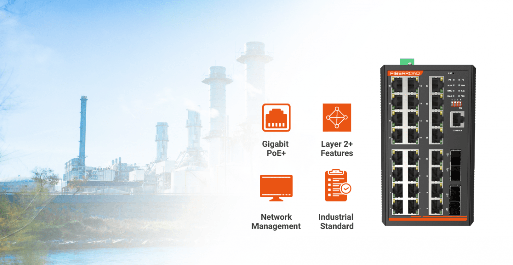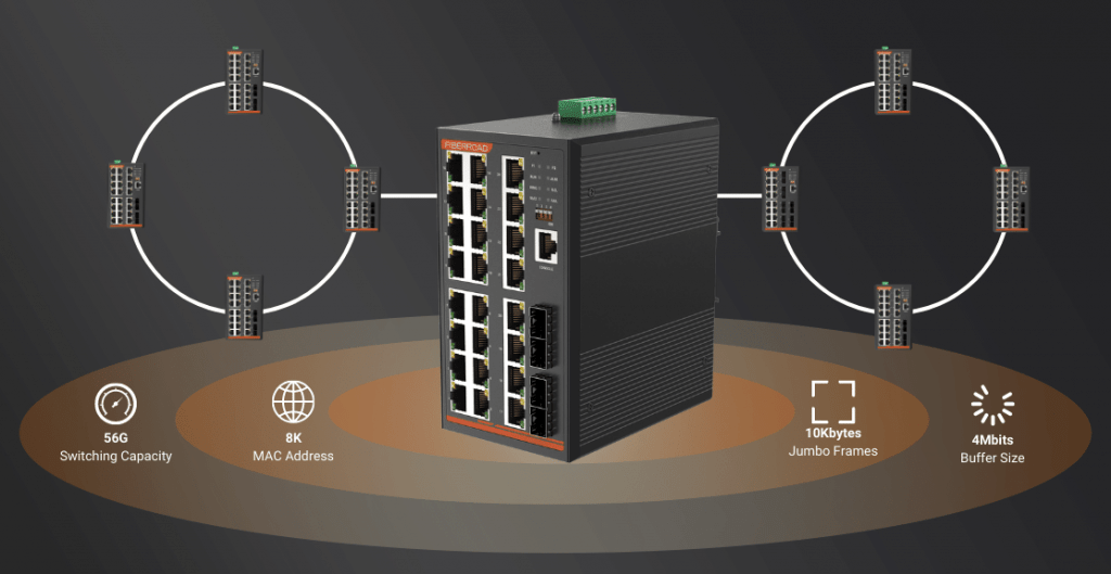 Switch industrial gestionable con 4 uplinks 100/1000M SFP y 24 puertos 10/100/1000BaseTX. Alimentación 48-56Vdc. Soporte VLAN, Q-in-Q, QoS, redundancia lineal LACP y en anillos RSTP/ERPS. Gestión por consola, Telnet, WebUI y SNMP.